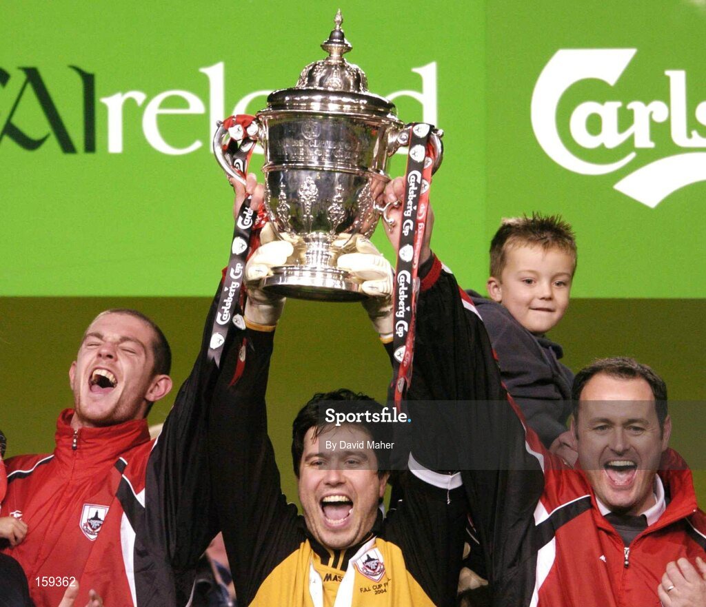24 October 2004; Stand in captain Stephen O'Brien, centre, with suspended captain Barry Ferguson, left and manager Alan Mathews, Longford Town, lift the FAI Carlsberg Cup at the end of the game after victory over Waterford United. 2004 FAI Carlsberg Cup Final, Longford Town v Waterford United, Lansdowne Road, Dublin. Picture credit; David Maher / SPORTSFILE