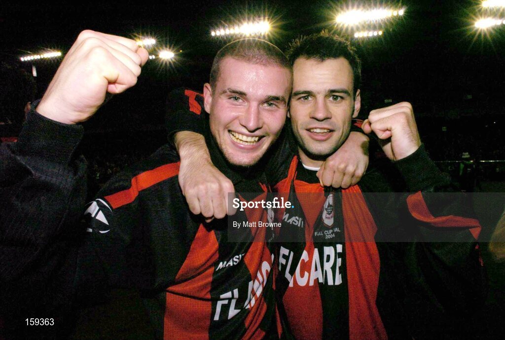 24 October 2004; Longford Town's Shane Barrett, left, and John Martin celebrate after victory over Waterford United. 2004 FAI Carlsberg Cup Final, Longford Town v Waterford United, Lansdowne Road, Dublin. Picture credit; Matt Browne / SPORTSFILE