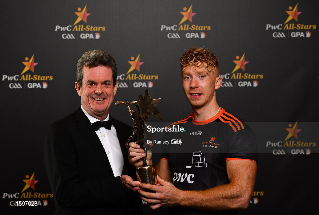 2 November 2018; Feargal O'Rourke, Managing Partner, PwC, with PwC hurler of the year Cian Lynch at the PwC All Stars 2018 at the Convention Centre in Dublin. Photo by Ramsey Cardy/Sportsfile