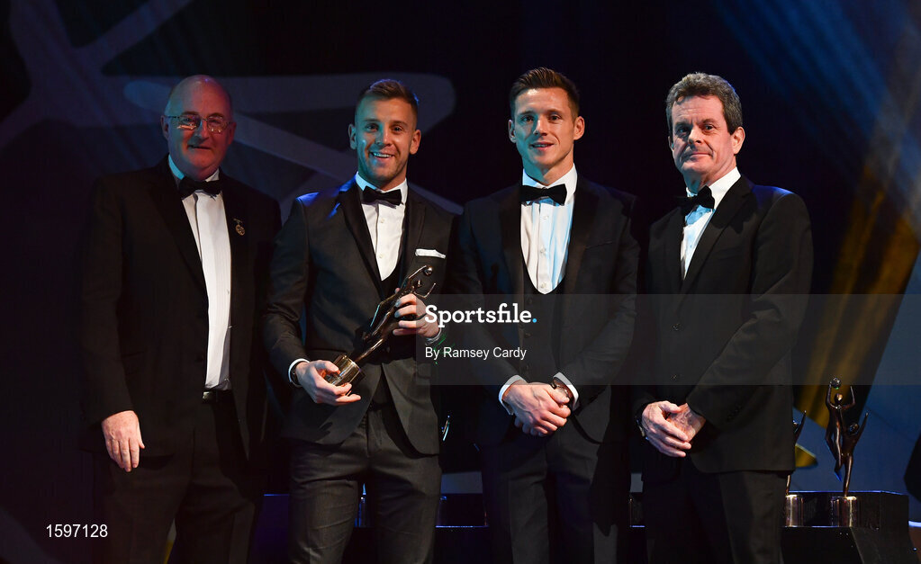 2 November 2018; Dublin footballer Jonny Cooper is presented with his PwC All Star award by, from left, Uachtarán Chumann Lúthchleas Gael John Horan, GPA CEO Paul Flynn, and CEO of PWC Ireland Feargal O'Rourke during the PwC All Stars 2018 at the Convention Centre in Dublin. Photo by Ramsey Cardy/Sportsfile