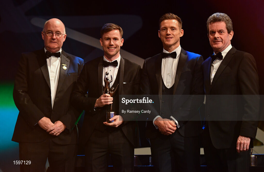 2 November 2018; Monaghan footballer Karl O'Connell is presented with his PwC All Star award by, from left, Uachtarán Chumann Lúthchleas Gael John Horan, GPA CEO Paul Flynn, and CEO of PWC Ireland Feargal O'Rourke during the PwC All Stars 2018 at the Convention Centre in Dublin. Photo by Ramsey Cardy/Sportsfile
