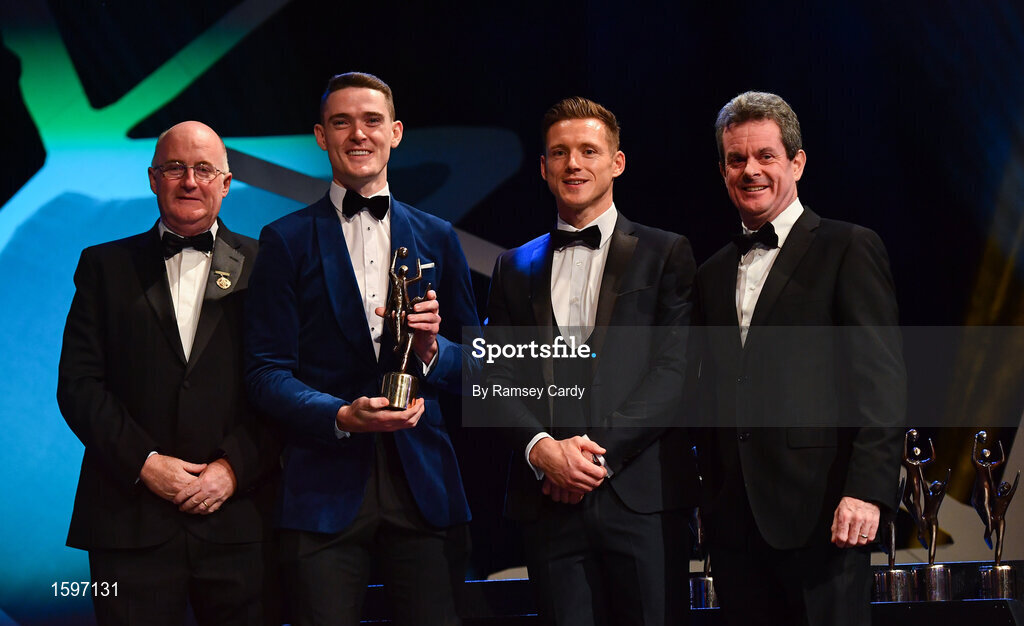 2 November 2018; Dublin footballer Brian Fenton is presented with his PwC All Star award by, from left, Uachtarán Chumann Lúthchleas Gael John Horan, GPA CEO Paul Flynn, and CEO of PwC Ireland Feargal O'Rourke during the PwC All Stars 2018 at the Convention Centre in Dublin. Photo by Ramsey Cardy/Sportsfile