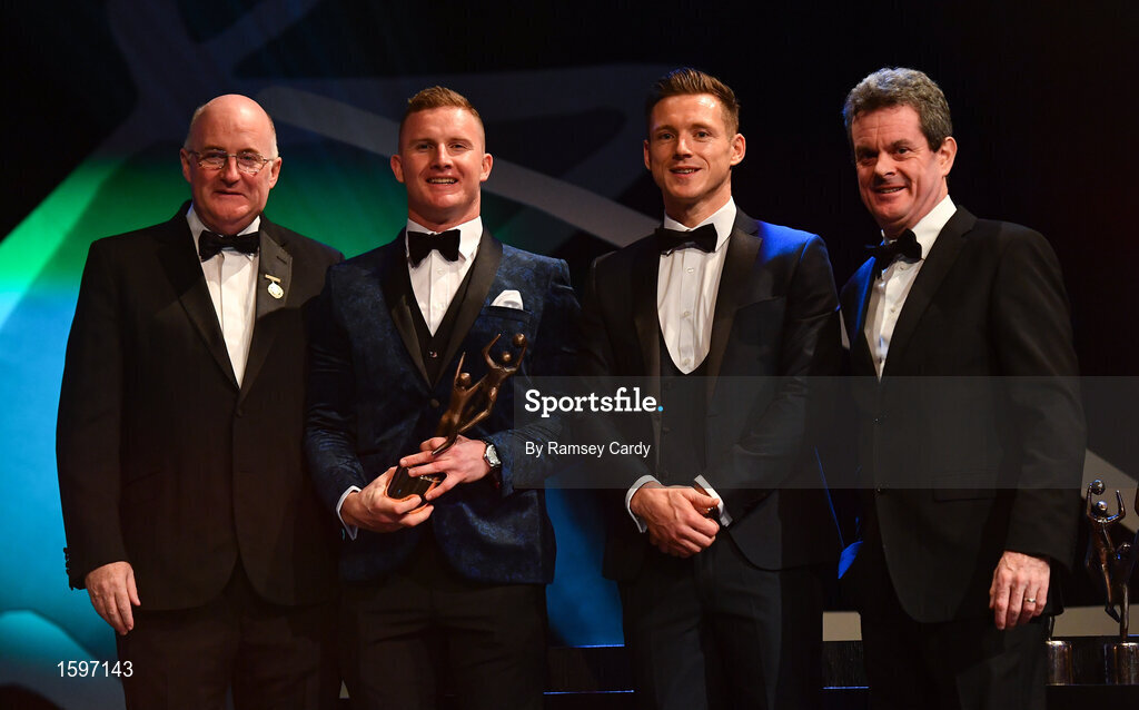 2 November 2018; Dublin footballer Ciarán Kilkenny is presented with his PwC All Star award by, from left, Uachtarán Chumann Lúthchleas Gael John Horan, GPA CEO Paul Flynn, and CEO of PwC Ireland Feargal O'Rourke during the PwC All Stars 2018 at the Convention Centre in Dublin. Photo by Ramsey Cardy/Sportsfile