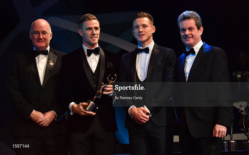 2 November 2018; Dublin footballer Paul Mannion is presented with his PwC All Star award by, from left, Uachtarán Chumann Lúthchleas Gael John Horan, GPA CEO Paul Flynn, and CEO of PwC Ireland Feargal O'Rourke during the PwC All Stars 2018 at the Convention Centre in Dublin. Photo by Ramsey Cardy/Sportsfile