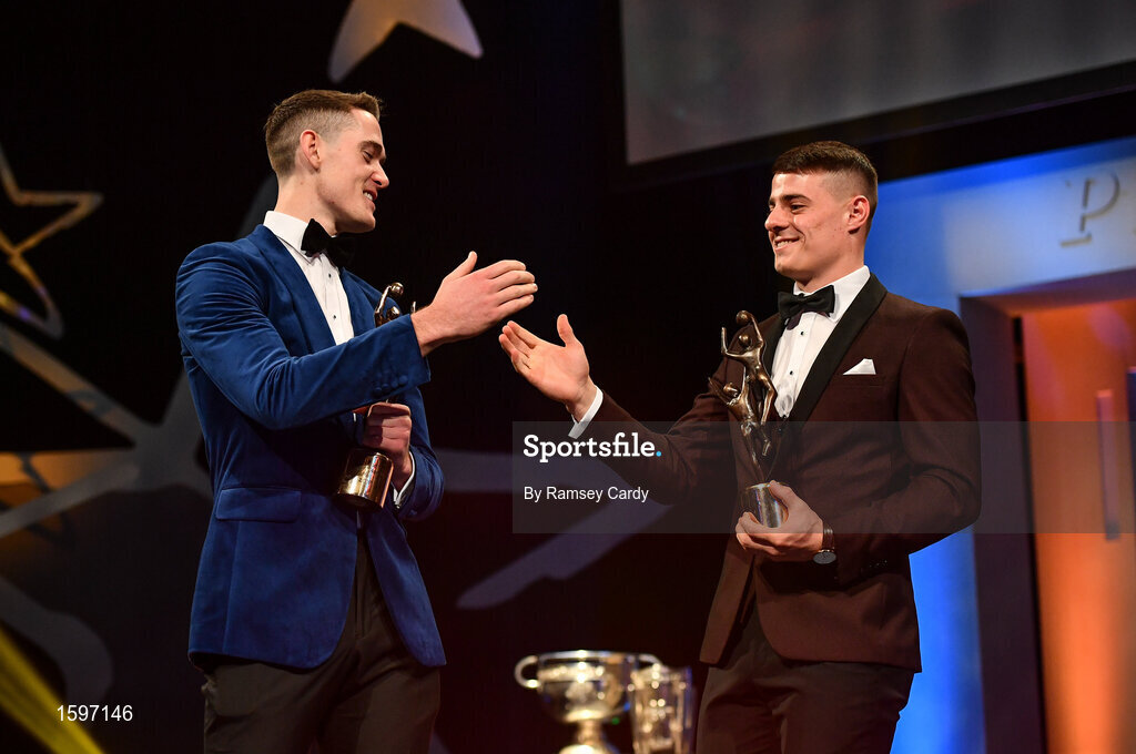 2 November 2018; Dublin footballers Brian Fenton, left, and Brian Howard with their PwC All Star awards during the PwC All Stars 2018 at the Convention Centre in Dublin. Photo by Ramsey Cardy/Sportsfile