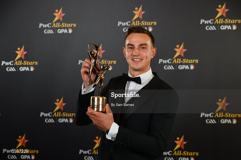 2 November 2018; Clare hurler Peter Duggan with his All-Star award at the PwC All Stars 2018 at the Convention Centre in Dublin. Photo by Sam Barnes/Sportsfile