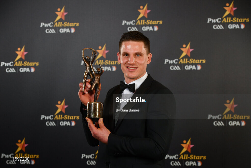 2 November 2018; Clare hurler John Conlon with his All-Star award at the the PwC All Stars 2018 at the Convention Centre in Dublin. Photo by Sam Barnes/Sportsfile