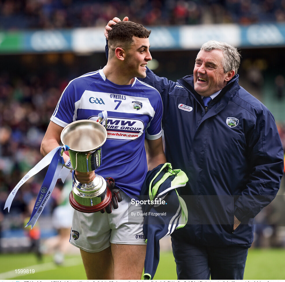 Official seal of approval. With Laois fortunes taking a turn for the better following promotion and a win over Carlow in the Division Four final, Robert Pigott gets a pat on the head from county board chairman Lawrence Phelan for a job well done. This image may be reproduced free of charge when used in conjunction with a review of the book "A Season of Sundays 2018". All other usage © SPORTSFILE