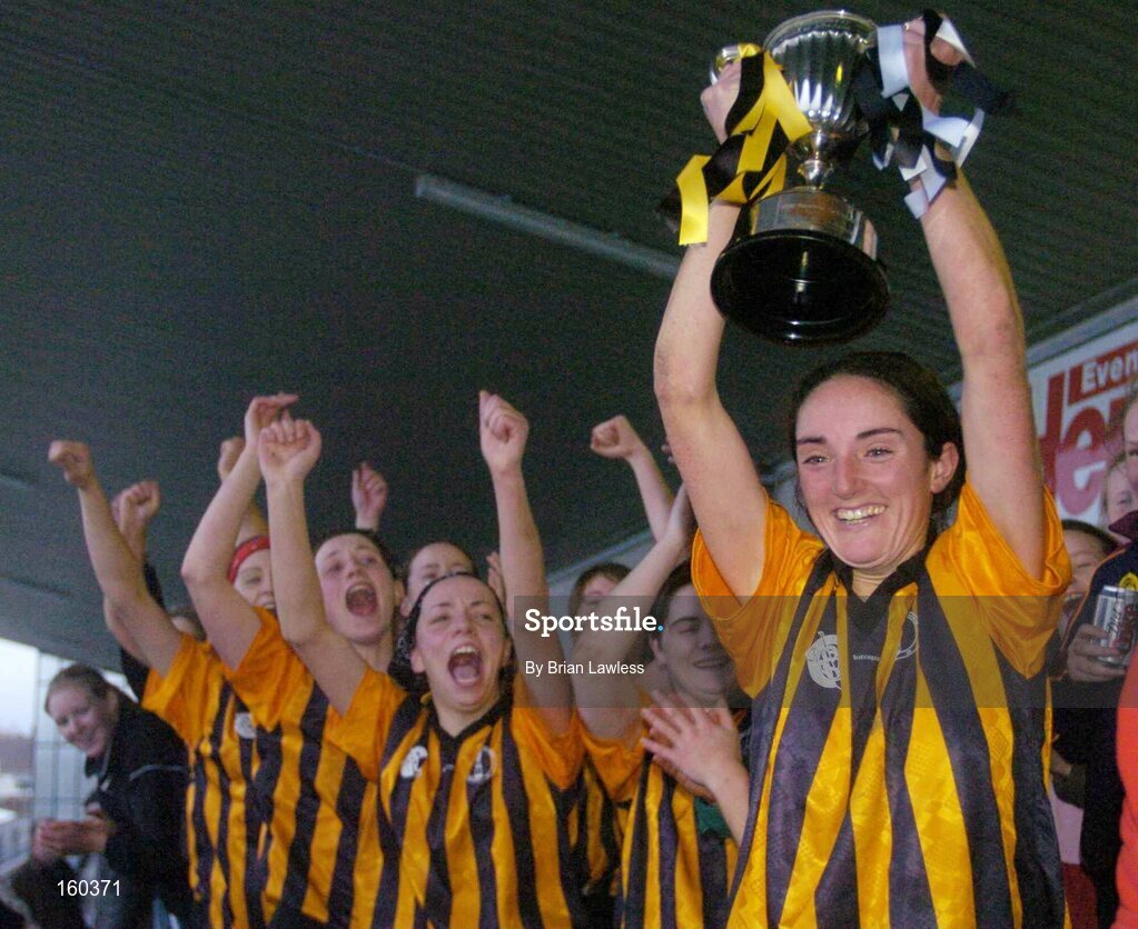 7 November 2004; Imelda Kennedy, St. Lachtains Freshford, lifts the cup after victory in the final. All-Ireland Senior Camogie Club Final, Granagh-Ballingarry v St. Lachtains Freshford, Parnell Park, Dublin. Picture credit; Brian Lawless / SPORTSFILE