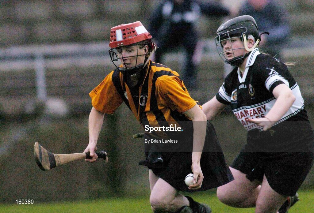 7 November 2004; Gillian Dillon Maher, St. Lachtains Freshford, in action against Fiona Morrisey, Granagh-Ballingarry. All-Ireland Senior Camogie Club Final, Granagh-Ballingarry v St. Lachtains Freshford, Parnell Park, Dublin. Picture credit; Brian Lawless / SPORTSFILE