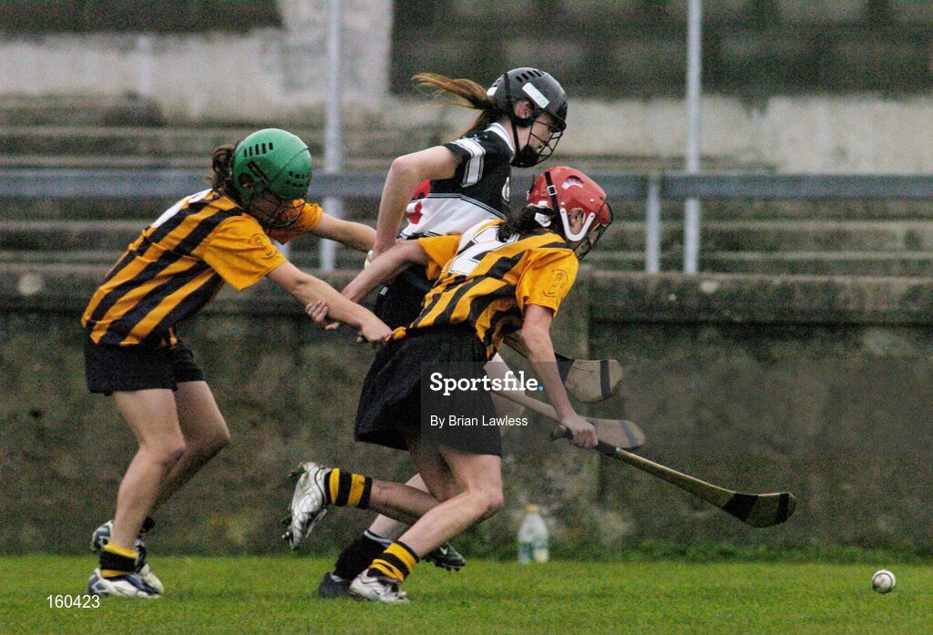 7 November 2004; Joanne Clifford, Granagh-Ballingarry, in action against Imelda Kennedy and Deirdre Delaney, left, St. Lachtains Freshford. All-Ireland Senior Camogie Club Final, Granagh-Ballingarry v St. Lachtains Freshford, Parnell Park, Dublin. Picture credit; Brian Lawless / SPORTSFILE