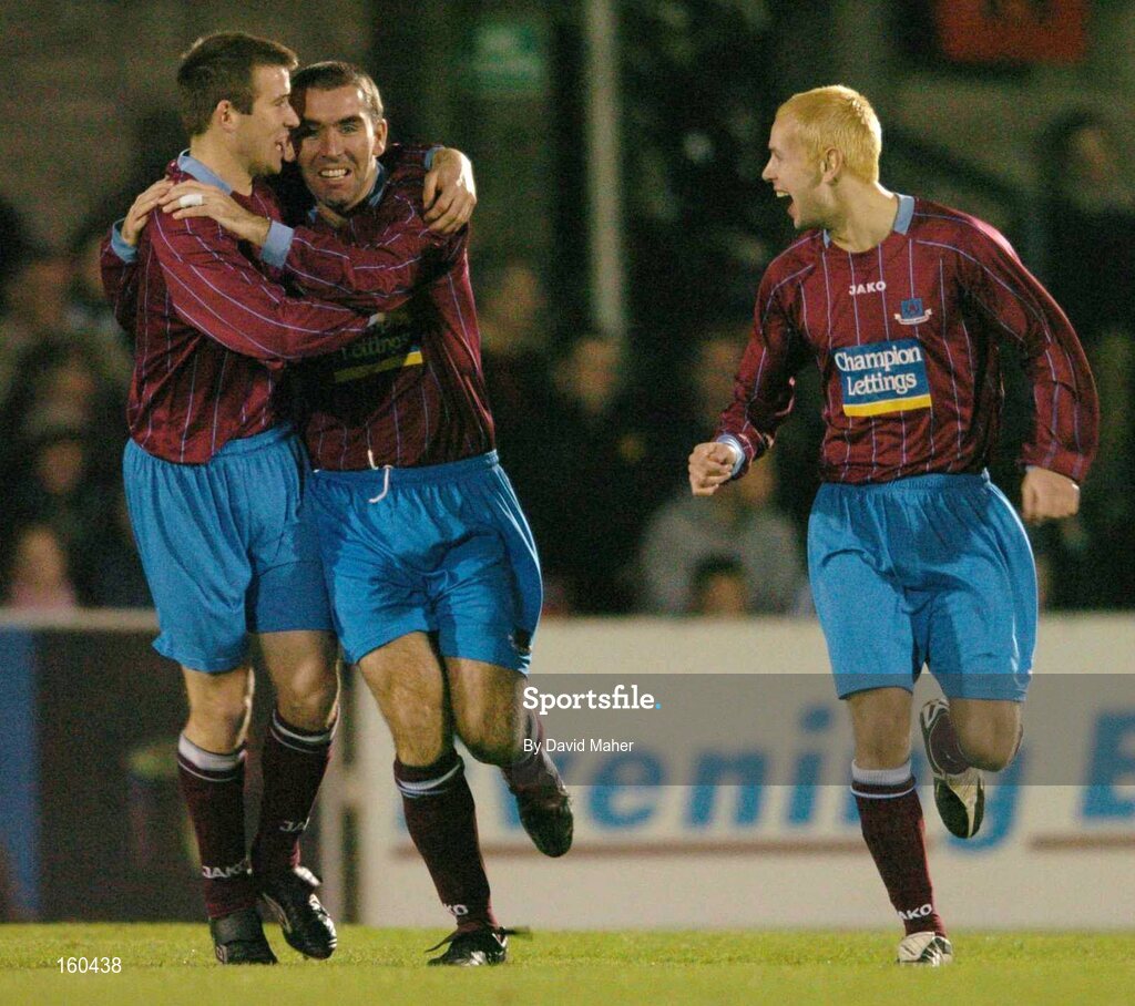 8 November 2004; Andy Myler, centre, Drogheda United, celebrates after scoring his sides first goal with team-mates Dave Freeman, left and Declan O'Brien. eircom league, Premier Division, Cork City v Drogheda United, Turners Cross, Cork. Picture credit; David Maher / SPORTSFILE