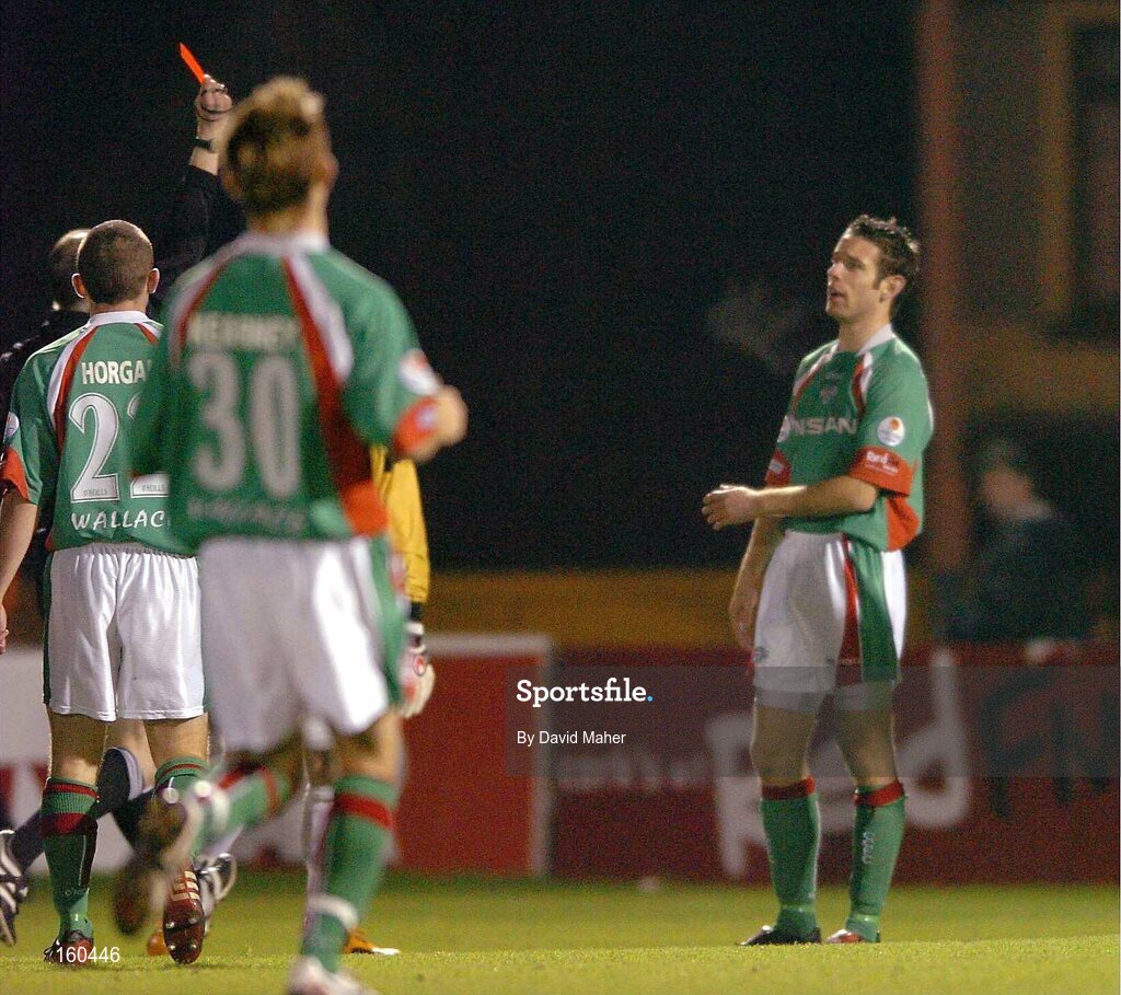8 November 2004; Referee, Dave McKeon, hidden, shows the red card to Alan Bennett, right, Cork City. eircom league, Premier Division, Cork City v Drogheda United, Turners Cross, Cork. Picture credit; David Maher / SPORTSFILE