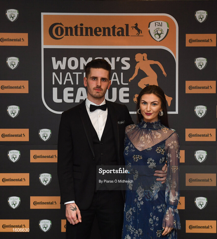 9 November 2018; Aaron Hartigan with Fionnuala Moran, Evoke.ie, upon arrival at the Continental Tyres Women’s National League Awards at the Ballsbridge Hotel in Dublin. Photo by Piaras Ó Mídheach/Sportsfile