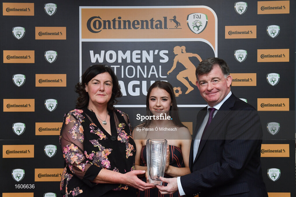 9 November 2018; U17 Player of the Year Emily Whelan of Shelbourne is presented with her award by Frances Smith, Women's National League Committee, and Eddie Ryan, Marketing Director Advance Pitstop, during the Continental Tyres Women’s National League Awards at the Ballsbridge Hotel in Dublin. Photo by Piaras Ó Mídheach/Sportsfile