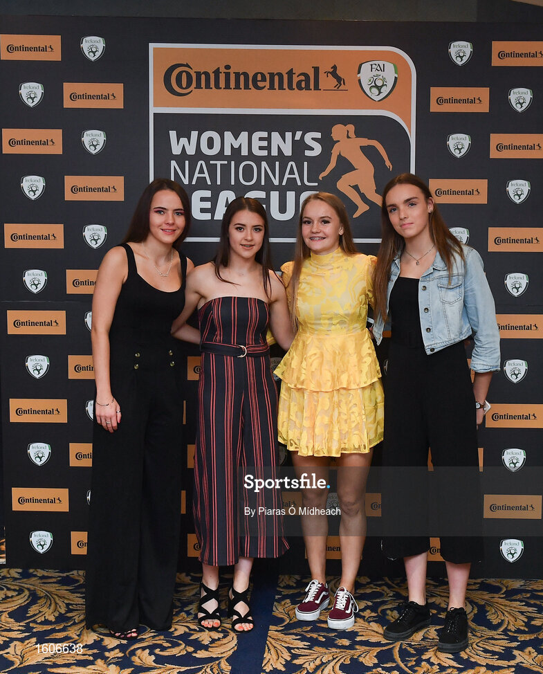 9 November 2018; Shelbourne WFC players, from left, Oleta Griffin, Emily Whelan, Isibeal Atkinson and Rebecca Cooke upon arrival at the Continental Tyres Women’s National League Awards at the Ballsbridge Hotel in Dublin. Photo by Piaras Ó Mídheach/Sportsfile