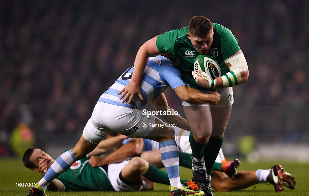10 November 2018; Tadhg Furlong of Ireland is tackled by Nicholas Sanchez of Argentina during the Guinness Series International match between Ireland and Argentina at the Aviva Stadium in Dublin. Photo by Ramsey Cardy/Sportsfile