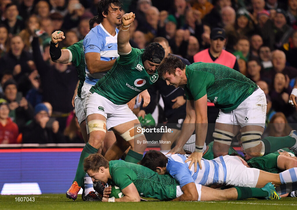 10 November 2018; Kieran Marmion, centre, of Ireland celebrates scoring his side's first try alongside teammates Sean O’Brien, left, and Iain Henderson during the Guinness Series International match between Ireland and Argentina at the Aviva Stadium in Dublin. Photo by Brendan Moran/Sportsfile