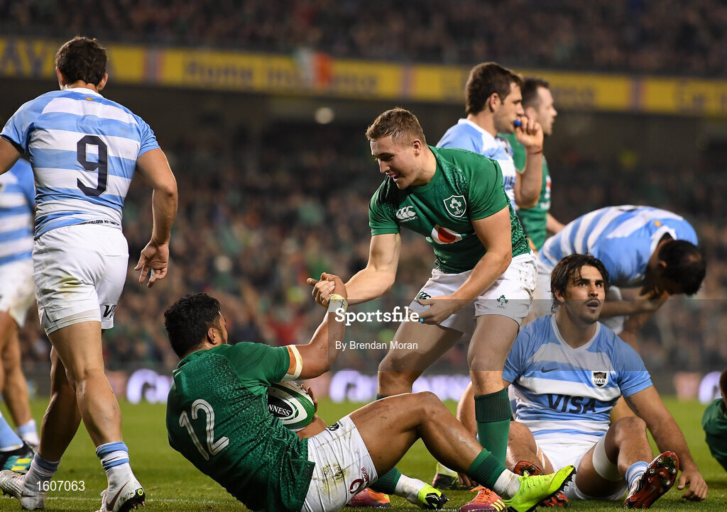 10 November 2018; Bundee Aki, left, of Ireland celebrates after scoring his side's second try with teammate Jordan Larmour during the Guinness Series International match between Ireland and Argentina at the Aviva Stadium in Dublin. Photo by Brendan Moran/Sportsfile