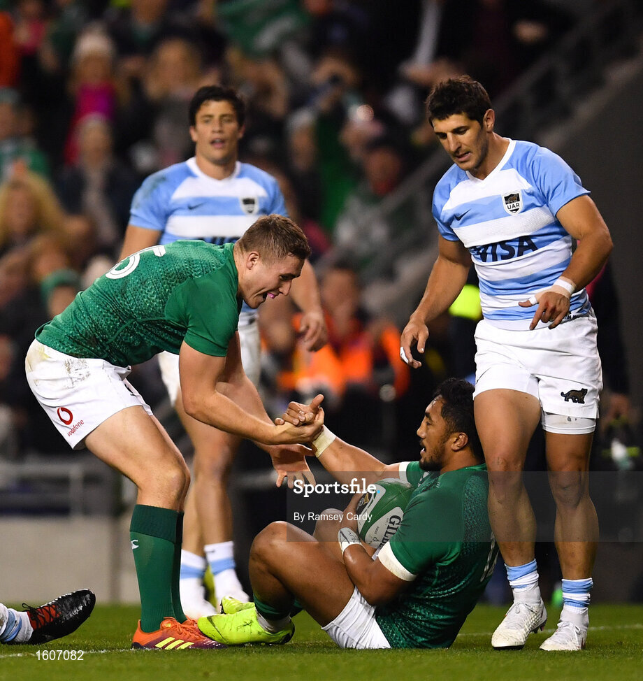10 November 2018; Bundee Aki of Ireland celebrates with team-mate Jordan Larmour, left, after scoring his side's second try during the Guinness Series International match between Ireland and Argentina at the Aviva Stadium in Dublin. Photo by Ramsey Cardy/Sportsfile