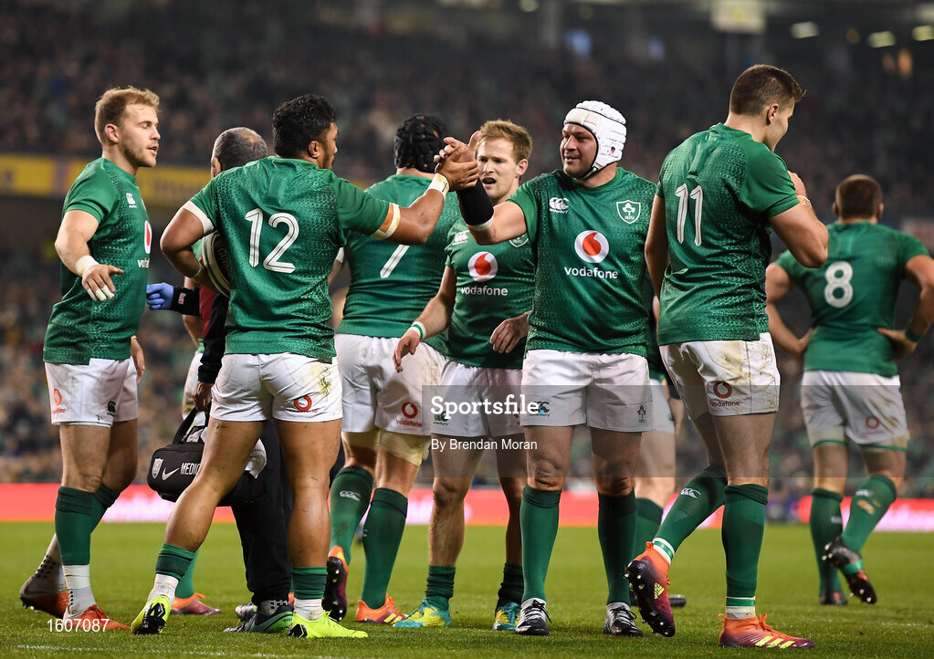10 November 2018; Bundee Aki, 12, of Ireland celebrates after scoring his side's second try with teammate Rory Best during the Guinness Series International match between Ireland and Argentina at the Aviva Stadium in Dublin. Photo by Brendan Moran/Sportsfile