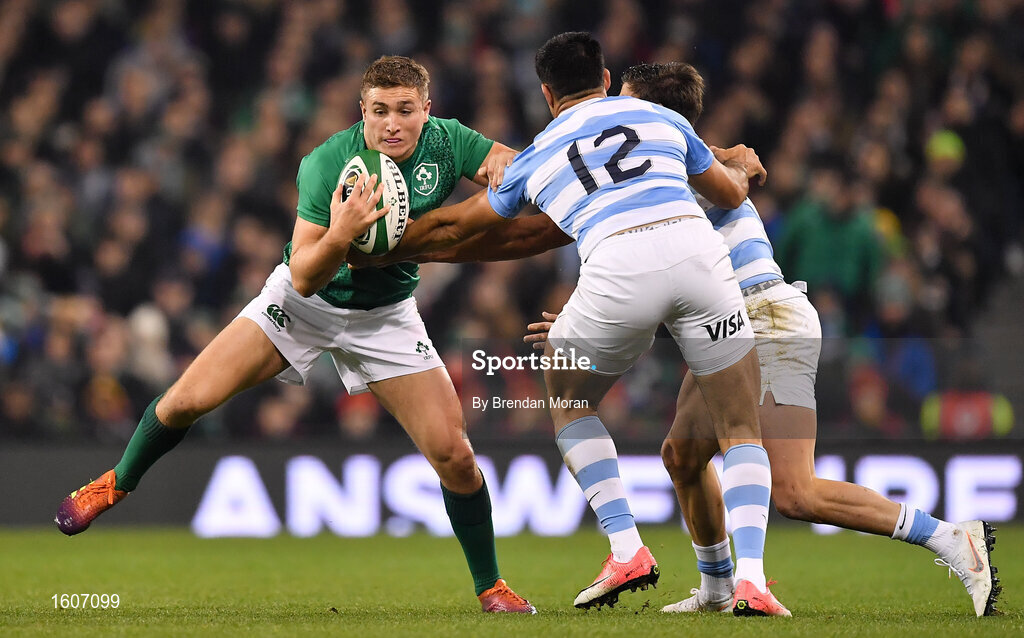 10 November 2018; Jordan Larmour of Ireland is tackled by Bautista Delguy, left, and Jeronimo de la Fuente of Argentina during the Guinness Series International match between Ireland and Argentina at the Aviva Stadium in Dublin. Photo by Brendan Moran/Sportsfile