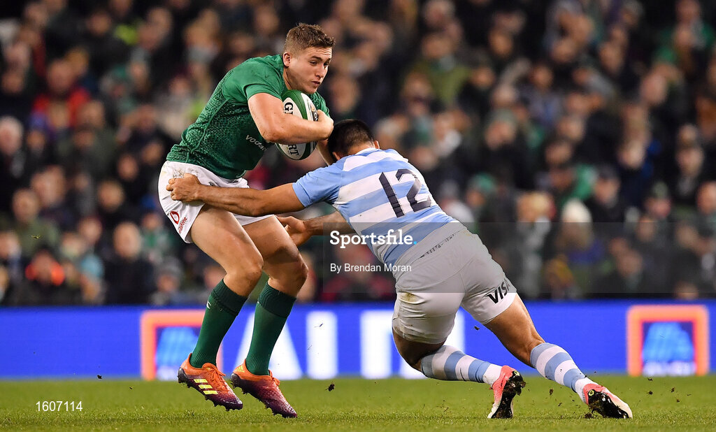 10 November 2018; Jordan Larmour of Ireland is tackled by Jeronimo de la Fuente of Argentina during the Guinness Series International match between Ireland and Argentina at the Aviva Stadium in Dublin. Photo by Brendan Moran/Sportsfile