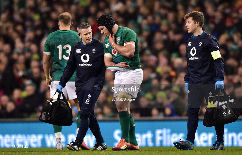 10 November 2018; Sean O’Brien of Ireland leaves the pitch with team doctor Ciaran Cosgrave after picking up an injury during the Guinness Series International match between Ireland and Argentina at the Aviva Stadium in Dublin. Photo by Matt Browne/Sportsfile