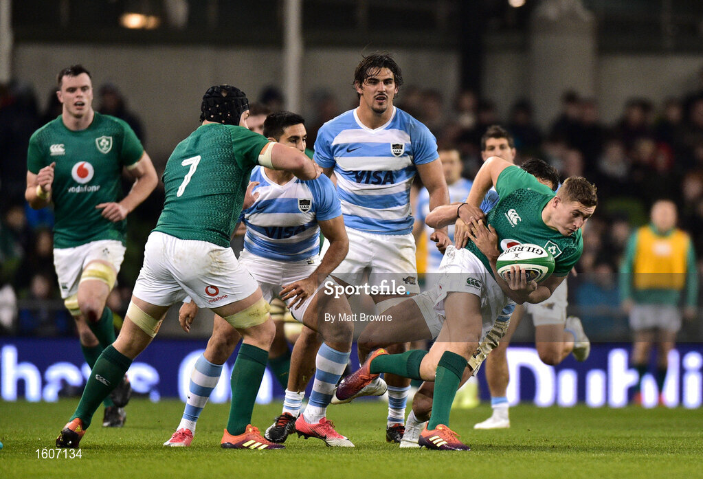 10 November 2018; Jordan Larmour of Ireland is tackled by Bautista Delguy of Argentina during the Guinness Series International match between Ireland and Argentina at the Aviva Stadium in Dublin. Photo by Matt Browne/Sportsfile