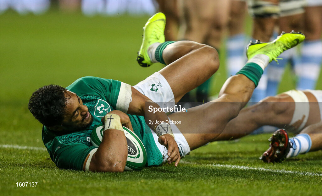 10 November 2018; Bundee Aki of Ireland scores his side's second try during the Guinness Series International match between Ireland and Argentina at the Aviva Stadium in Dublin. Photo by John Dickson/Sportsfile