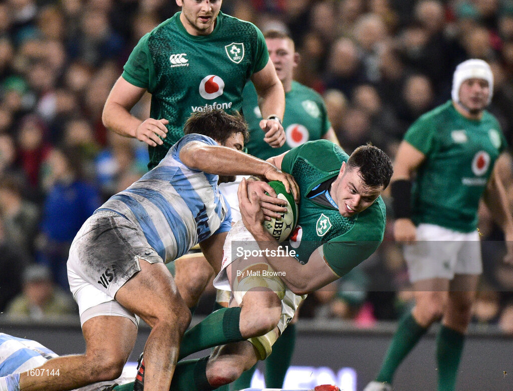10 November 2018; James Ryan of Ireland is tackled by Santiago Medrano of Argentina during the Guinness Series International match between Ireland and Argentina at the Aviva Stadium in Dublin. Photo by Matt Browne/Sportsfile