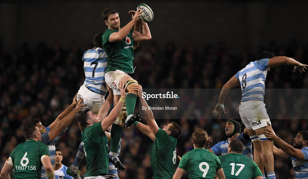 10 November 2018; Iain Henderson of Ireland wins a line-out ahead of Guido Petti of Argentina during the Guinness Series International match between Ireland and Argentina at the Aviva Stadium in Dublin. Photo by Brendan Moran/Sportsfile