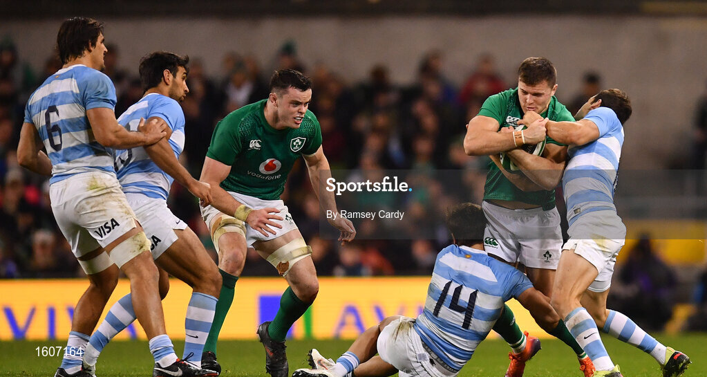 10 November 2018; Jacob Stockdale of Ireland is tackled by Bautista Delguy, left, and Nicholas Sanchez of Argentina during the Guinness Series International match between Ireland and Argentina at the Aviva Stadium in Dublin. Photo by Ramsey Cardy/Sportsfile