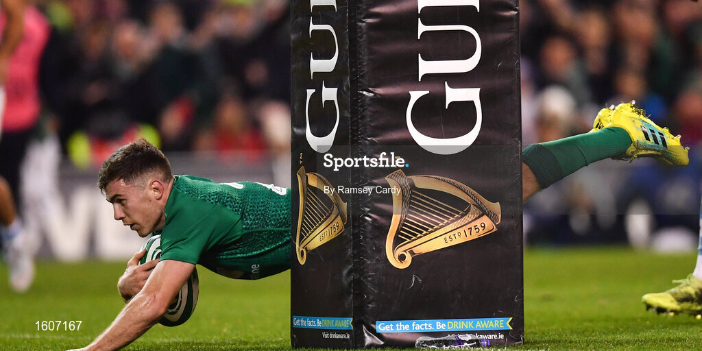 10 November 2018; Luke McGrath of Ireland dives over to score his side's third try during the Guinness Series International match between Ireland and Argentina at the Aviva Stadium in Dublin. Photo by Ramsey Cardy/Sportsfile