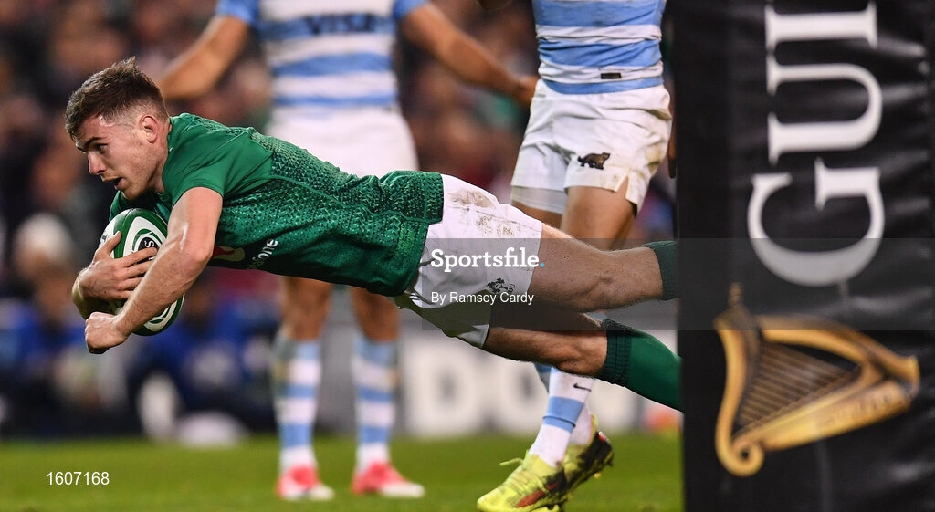 10 November 2018; Luke McGrath of Ireland dives over to score his side's third try during the Guinness Series International match between Ireland and Argentina at the Aviva Stadium in Dublin. Photo by Ramsey Cardy/Sportsfile