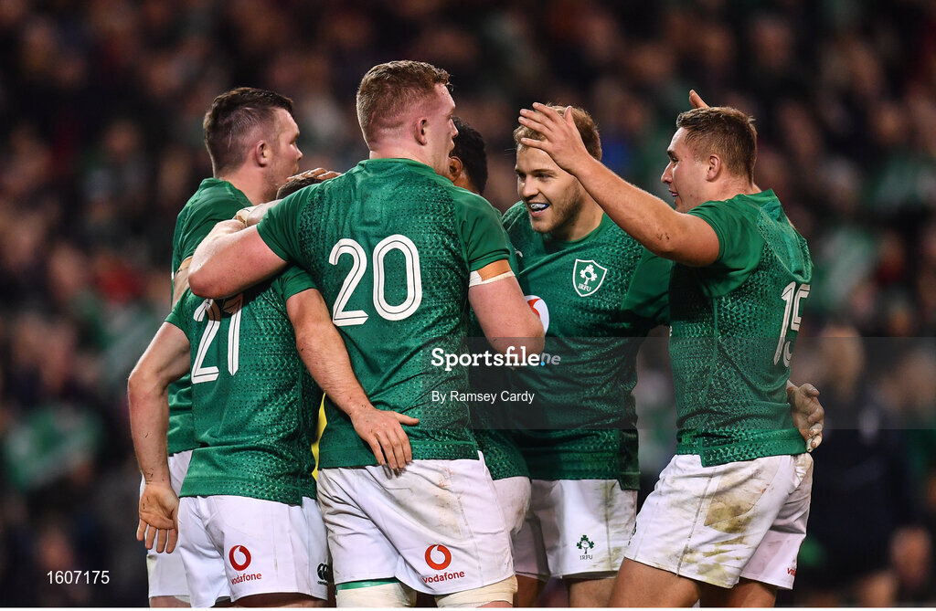 10 November 2018; Luke McGrath of Ireland celebrates with team-mates after scoring his side's third try during the Guinness Series International match between Ireland and Argentina at the Aviva Stadium in Dublin. Photo by Ramsey Cardy/Sportsfile