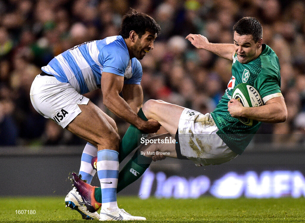 10 November 2018; Jonathan Sexton of Ireland is tackled by Matias Orlando of Argentina during the Guinness Series International match between Ireland and Argentina at the Aviva Stadium in Dublin. Photo by Matt Browne/Sportsfile