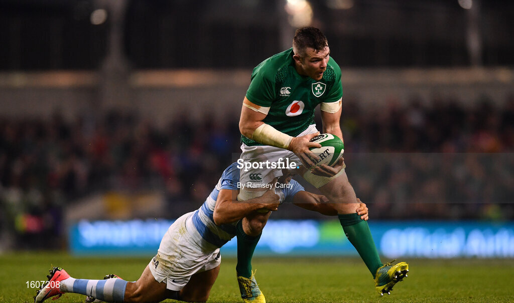 10 November 2018; Peter O’Mahony of Ireland is tackled by Jeronimo de la Fuente of Argentina during the Guinness Series International match between Ireland and Argentina at the Aviva Stadium in Dublin. Photo by Ramsey Cardy/Sportsfile