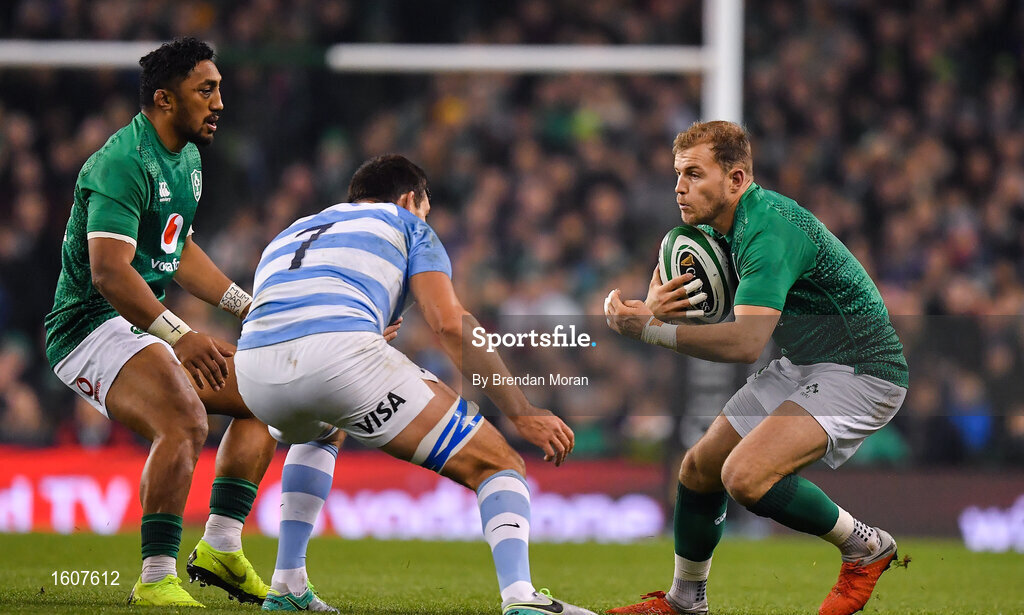 10 November 2018; Will Addison of Ireland, supported by team-mate Bundee Aki, in action against Guido Petti of Argentina during the Guinness Series International match between Ireland and Argentina at the Aviva Stadium in Dublin. Photo by Brendan Moran/Sportsfile