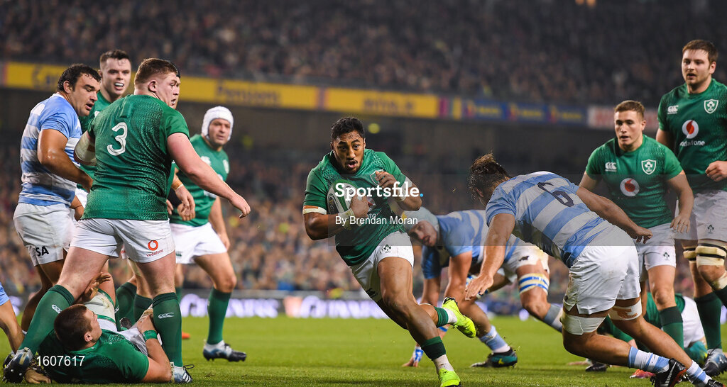 10 November 2018; Bundee Aki of Ireland breaks through to score his side's second try during the Guinness Series International match between Ireland and Argentina at the Aviva Stadium in Dublin. Photo by Brendan Moran/Sportsfile