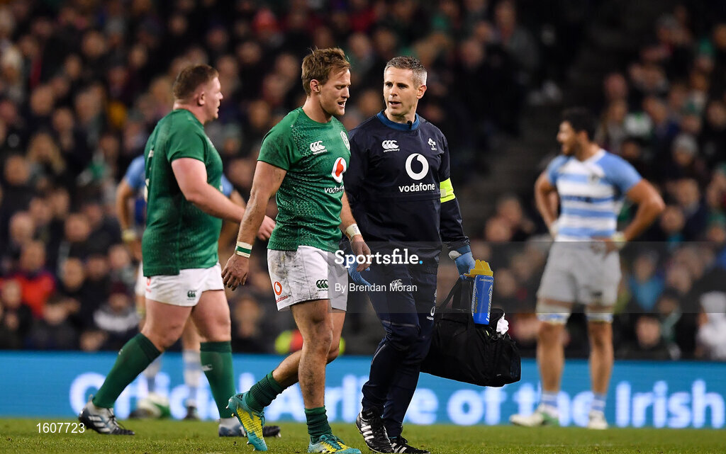 10 November 2018; Kieran Marmion of Ireland leaves the pitch with team doctor Dr. Ciaran Cosgrave during the Guinness Series International match between Ireland and Argentina at the Aviva Stadium in Dublin. Photo by Brendan Moran/Sportsfile