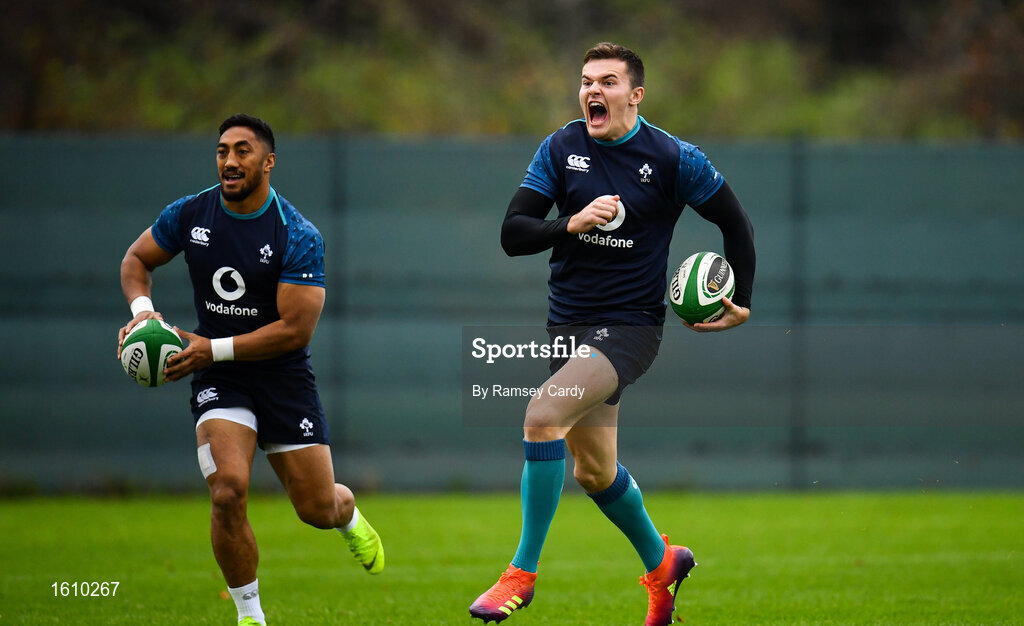 15 November 2018; Jacob Stockdale, right, and Bundee Aki during Ireland Rugby squad training at Carton House in Maynooth, Co. Kildare. Photo by Ramsey Cardy/Sportsfile