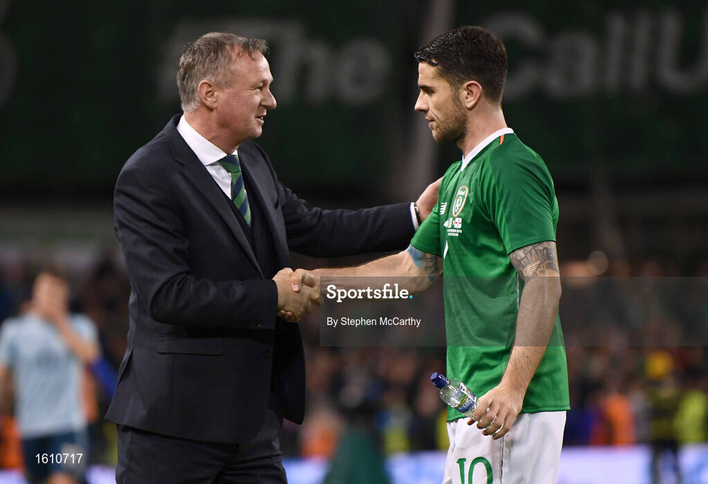 15 November 2018; Northern Ireland manager Michael O'Neill shakes hands with Robbie Brady of Republic of Ireland after the International Friendly match between Republic of Ireland and Northern Ireland at the Aviva Stadium in Dublin. Photo by Stephen McCarthy/Sportsfile