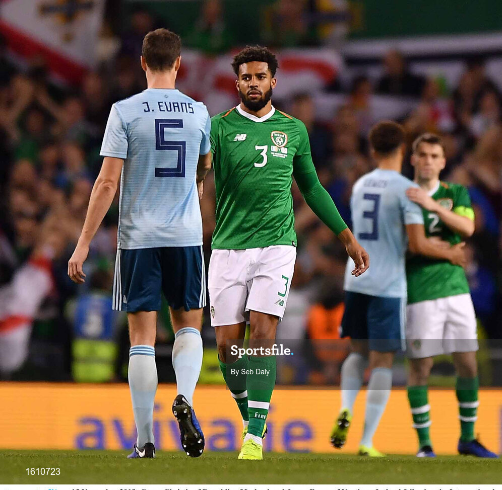 15 November 2018; Cyrus Christie of Republic of Ireland and Jonny Evans of Northern Ireland following the International Friendly match between Republic of Ireland and Northern Ireland at the Aviva Stadium in Dublin. Photo by Seb Daly/Sportsfile