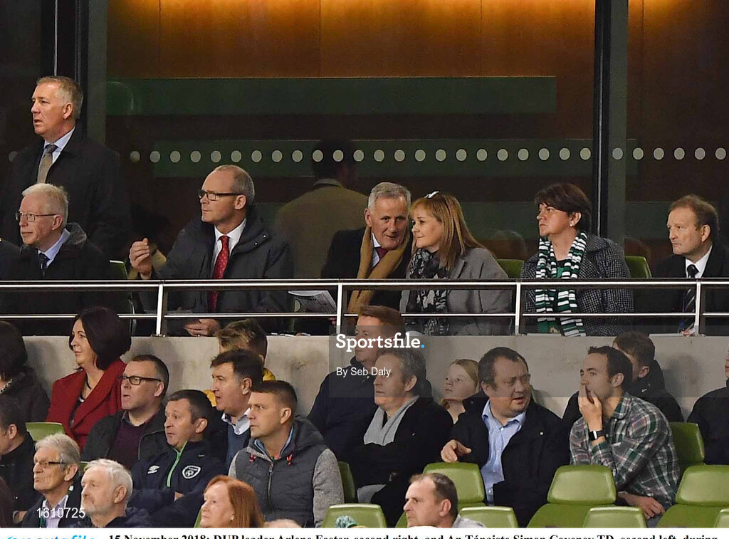 15 November 2018; DUP leader Arlene Foster, second right, and An Tánaiste Simon Coveney TD, second left, during the International Friendly match between Republic of Ireland and Northern Ireland at the Aviva Stadium in Dublin. Photo by Seb Daly/Sportsfile
