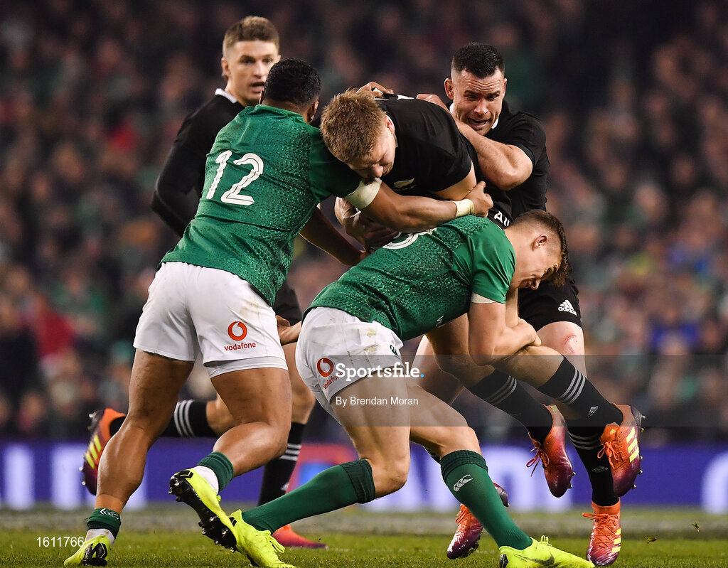 17 November 2018; Jack Goodhue of New Zealand is tackled by Bundee Aki, left, and Garry Ringrose of Ireland during the Guinness Series International match between Ireland and New Zealand at the Aviva Stadium in Dublin. Photo by Brendan Moran/Sportsfile