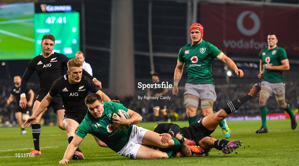 17 November 2018; Jacob Stockdale of Ireland is tackled by Aaron Smith of New Zealand on his way to scoring his side's first try during the Guinness Series International match between Ireland and New Zealand at the Aviva Stadium in Dublin. Photo by Ramsey Cardy/Sportsfile