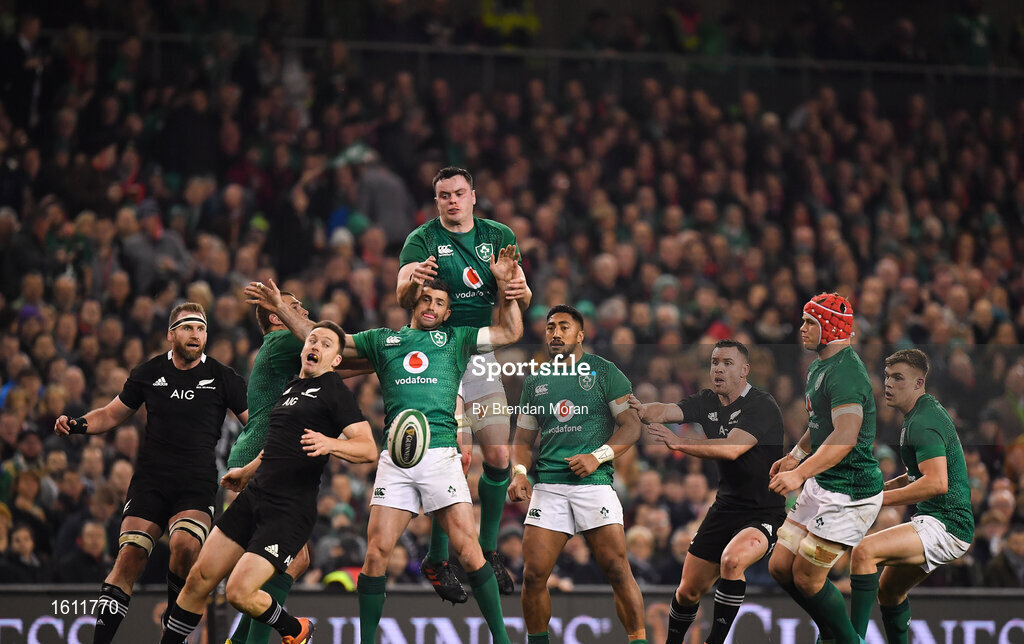 17 November 2018; Ben Smith, second from left, of New Zealand contests the ball with Rob Kearney, centre, and James Ryan, behind, of Ireland during the Guinness Series International match between Ireland and New Zealand at the Aviva Stadium in Dublin. Photo by Brendan Moran/Sportsfile