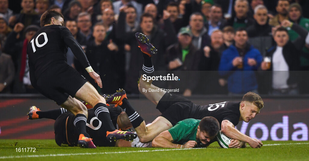 17 November 2018; Jacob Stockdale of Ireland scores his side's first try during the Guinness Series International match between Ireland and New Zealand at the Aviva Stadium in Dublin. Photo by David Fitzgerald/Sportsfile