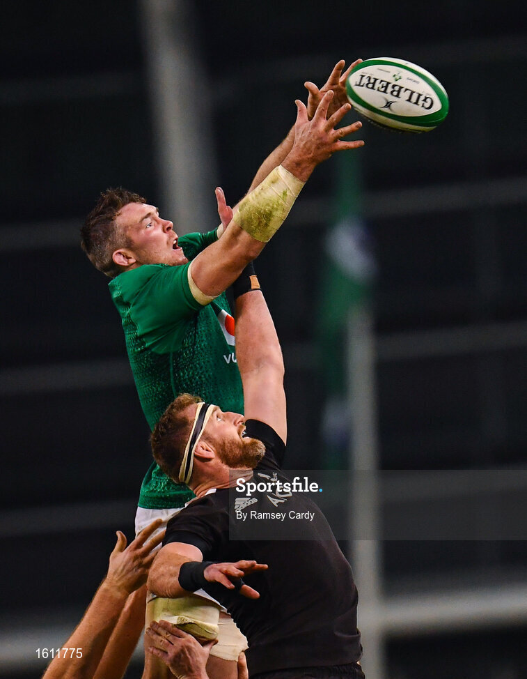 17 November 2018; Peter O'Mahony of Ireland wins possession in the lineout ahead of Kieran Read of New Zealand during the Guinness Series International match between Ireland and New Zealand at the Aviva Stadium in Dublin. Photo by Ramsey Cardy/Sportsfile